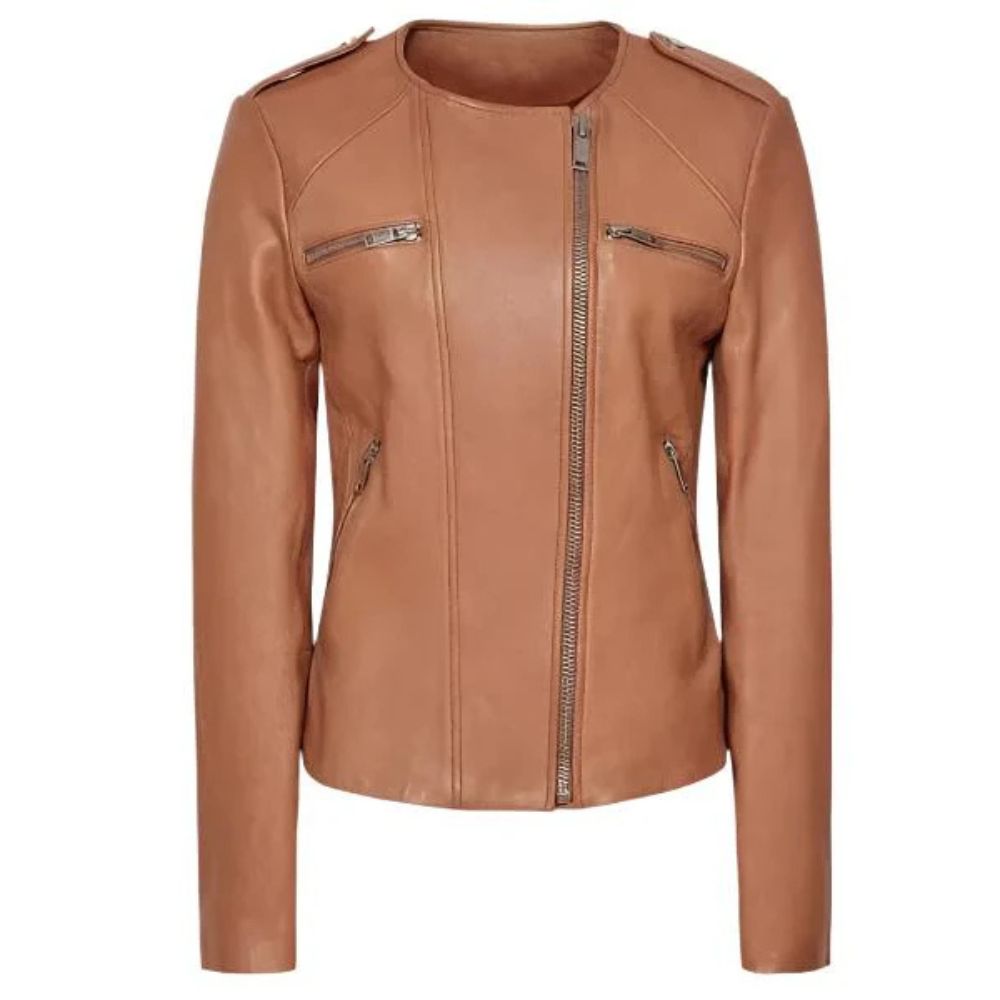 This gorgeou women's tan brown sheepskin leather jacket radiates sophistication and flair, making it a wardrobe staple. The round neck collar and asymmetrical, sleek zipper give it a contemporary edge, while the deep caramel color gives a hint of refinement and coziness. Made from high-quality leather, this jacket feels opulent and is quite durable. The numerous pockets offer useful practicality without sacrificing style. This adaptable piece will add flair to any ensemble, whether you wear it down with denim for a laid-back evening or up with a fitted suit.