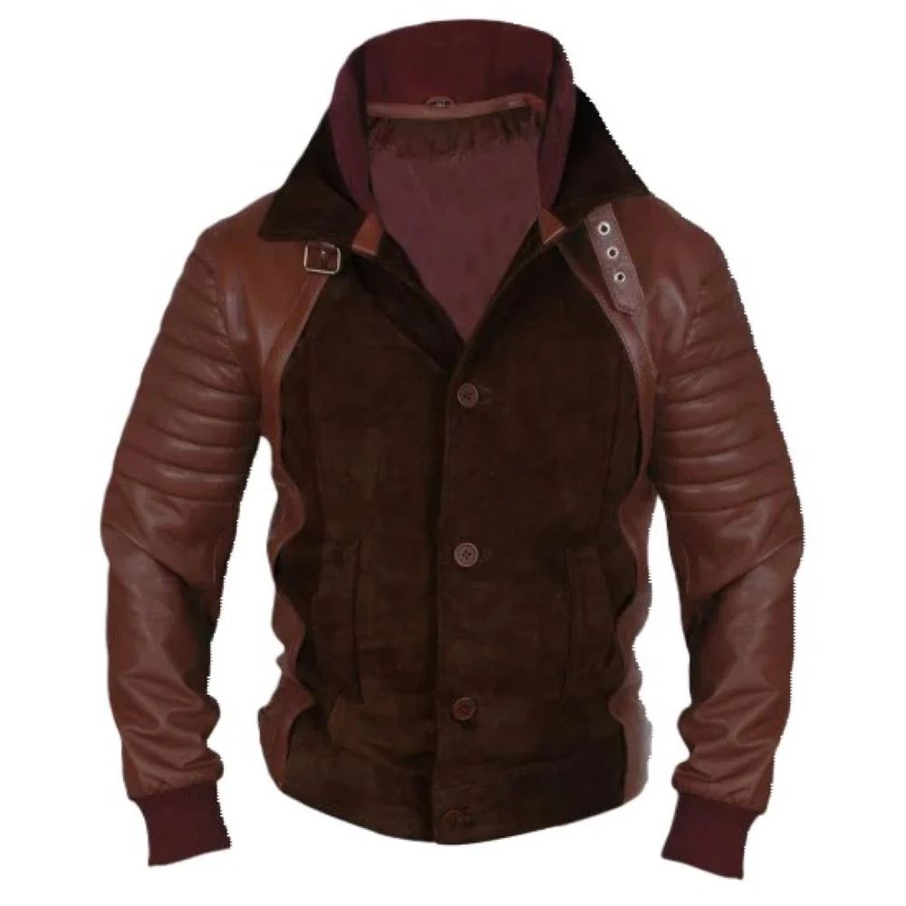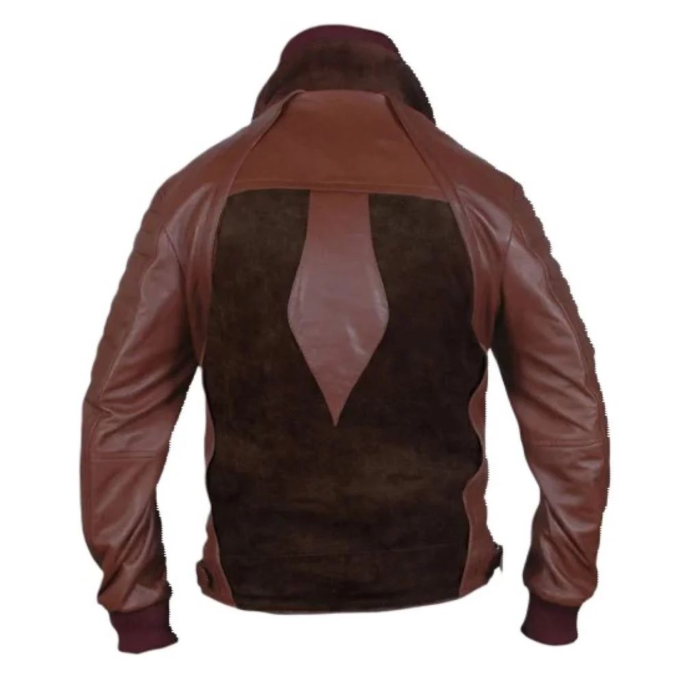 This sheepskin bomber jacket, which combines the rough demand of leather with the silky touch of the sheepskin, is a comfy expression of fashion. The deep shade of brown exudes a striking appearance. With a cushioned, eye-catching padded shoulder and an intriguing diamond-shaped leather board on the back, the design is sleek and contemporary. This board breaks up the sturdy sheepskin fabric and provides a little interest to the look. The diamond-shaped jacket appears to be expertly made, with attention to detail in both the sewing and the tools used. It's probably a warm and comfortable item that looks well with anything and can be dressed up or down.
