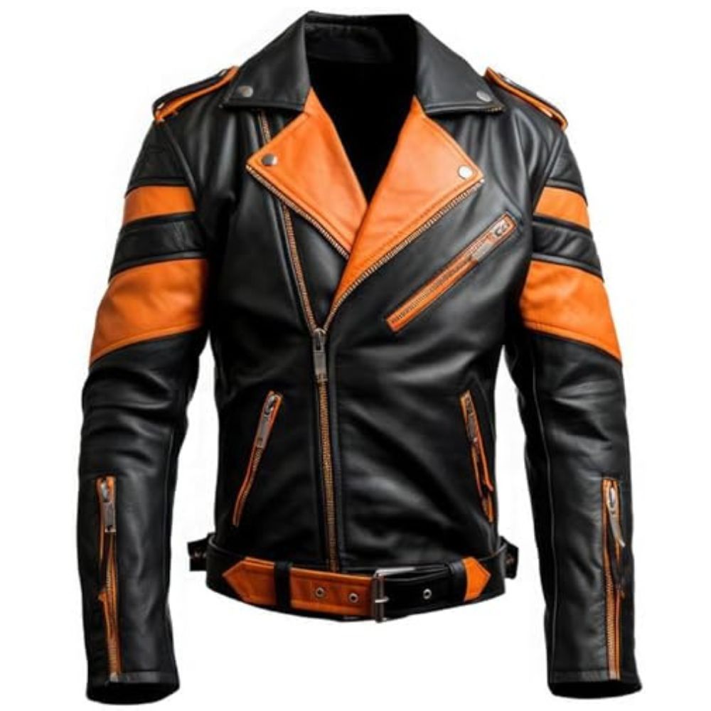 This eye-catching jacket is proof of the impact that colour can have. The brilliant contrast between orange and black, which makes a visually arresting statement, ensures the classic biker look's timeless appeal. This jacket feels sturdy and opulent because it is made of real sheepskin leather. A belted waist and padded panels are just two examples of the elaborate detailing that adds sophistication. This jacket is a daring and self-assured choice, regardless of whether you are a motorcycle enthusiast or just trying to dress up an ensemble.