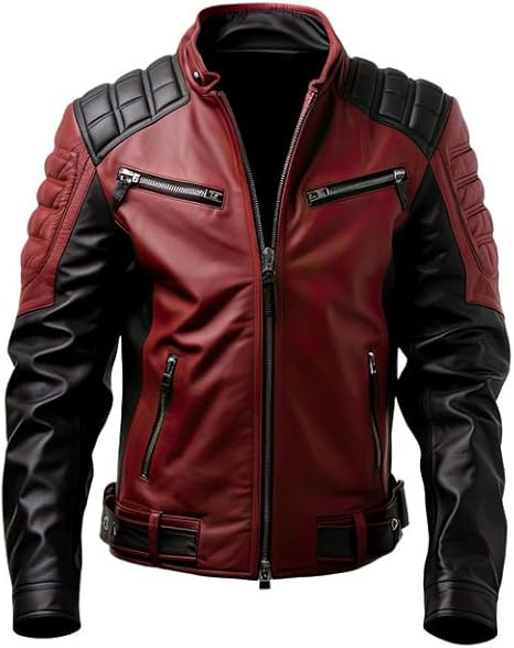 This chic and tough men's leather jacket is a must-have for anyone who appreciates fashion thanks to its eye-catching maroon and black color scheme. A pleasing silhouette is produced by the diagonal zipper closure, the belted waist, and the quilted panels on the shoulders and arms, which offer a hint of warmth and texture.