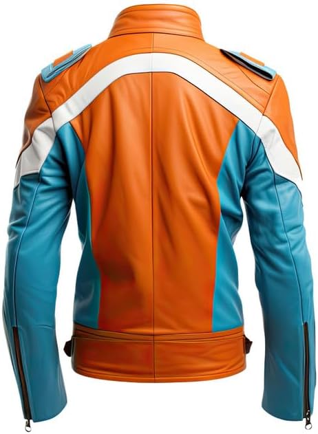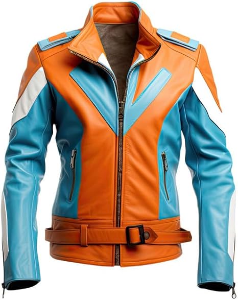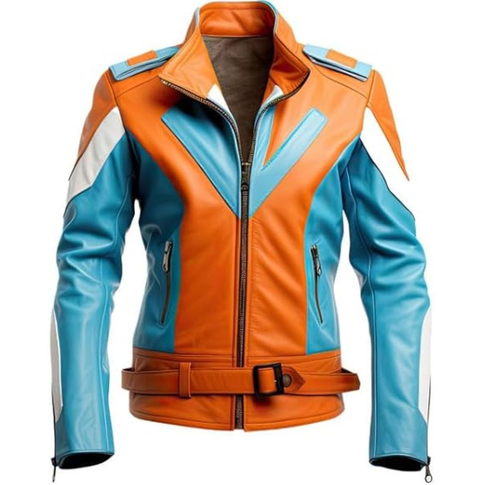With its vivid orange and blue color scheme and white embellishments, this eye-catching leather jacket has a retro-inspired style. The jacket features two front pockets, a zipper closing, and a stand-up collar in a traditional style. A large belt with a buckle gives an air of toughness and individuality. This jacket is unique and will turn heads thanks to the premium leather and striking colors.