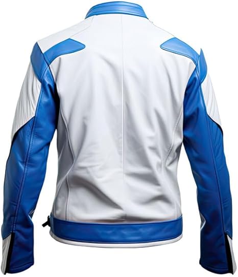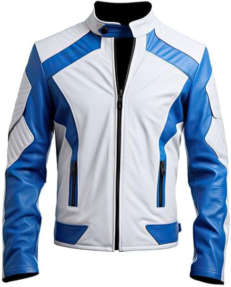 The dramatic and eye-catching style of this chic and contemporary jacket is created by the stunning combination of white and blue leather. It has an edgy and sporty vibe thanks to its streamlined and sleek design, contrasting panels, and asymmetrical zipper fastening.