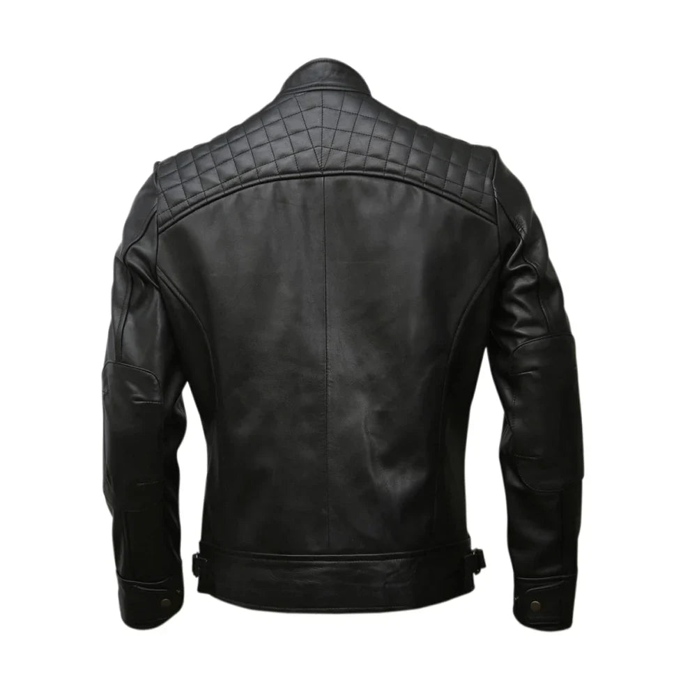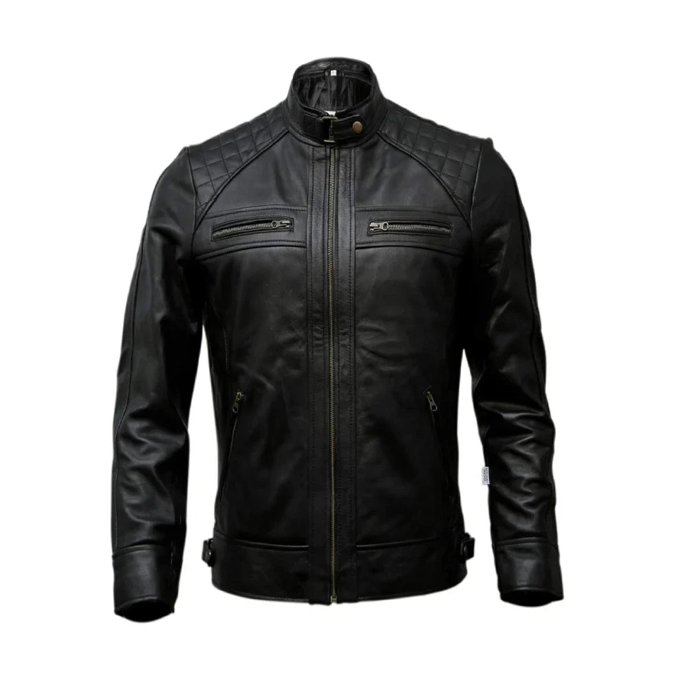 Unleash your inward resistance with our men's biker-darned calfskin downy. perfectly made from tall-quality calfskin, this downy mixes unwelcome quality with an advanced plan. The darned cushioning on the shoulders and sleeves gives astounding reassurance and takes in protestation, making it romanticized for both bicycle lifts and standard hassles. With its unmistakable veered-off zippers, unmistakable valuable pockets, and striking, smooth organize, this downy stands out from the mass. romanticize for those who see for a clarification piece that offers both figure and work, it’s an all-around prolongation to any cuddy that combines ever-having arranged with well-grounded highlights Counting picky sewing and a custom-made fit, this biker coat ensures a sharp, progressed. The premium calfskin makes a curious patina over time, making strides in its character. Arranged for both quality and design, it reliably moves from cruiser prepare to casual wear, giving an adaptable, standout piece in any wardrobe.