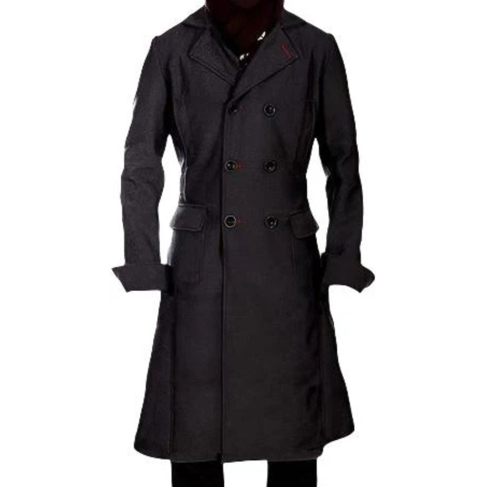 This timeless black trench longline coat brings to mind Sherlock Holmes's famous gear. The silhouette is elegant and classic thanks to the double-breasted fastening, notch lapel, and belted waist. The fabric of the coat, which is most likely made of durable cotton, has multiple pockets for added functionality. This trench coat's sophisticated style and useful functions make it ideal for bringing a hint of mystery and suspense into your wardrobe.