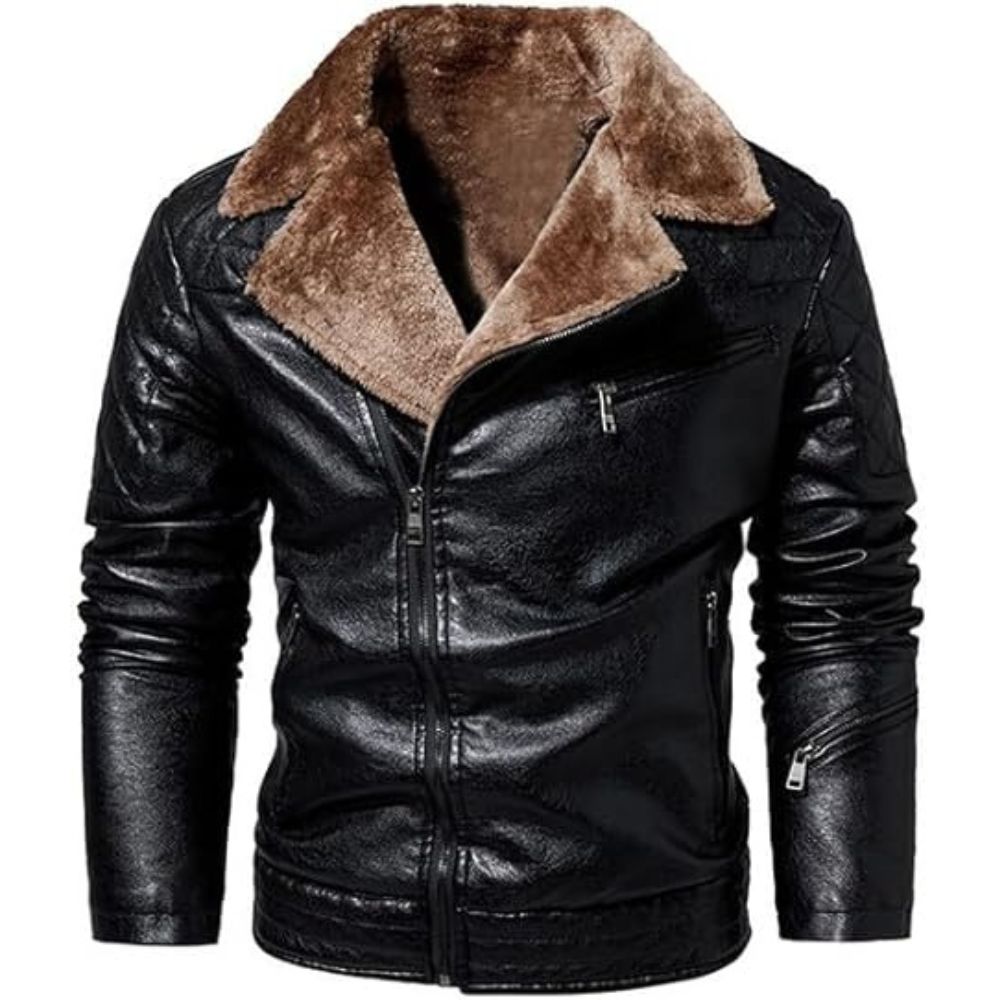 This chic sheepskin faux leather jacket for men is a multipurpose garment that seamlessly blends style and utility. A plush collar made of imitation fur adds style and warmth to the fashionable black exterior during the winter months. The asymmetrical zipper closure adds a subtle edge, and the multiple pockets provide ample room for holding necessities. The fitting design of the jacket gives it a contemporary, attractive appearance. This authentic leather outerwear is a must-have accessory whether you're stepping out for a night outing or just giving your casual outfit a bit more edge.