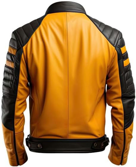 This eye-catching jacket blends a vibrant color scheme with a vintage motorbike motif. The jacket is made of premium distressed leather and has a striking black and yellow color scheme that gives it a unique look. The faded leather gives a tough, vintage-inspired style, and the clashing colors produce an eye-catching effect.